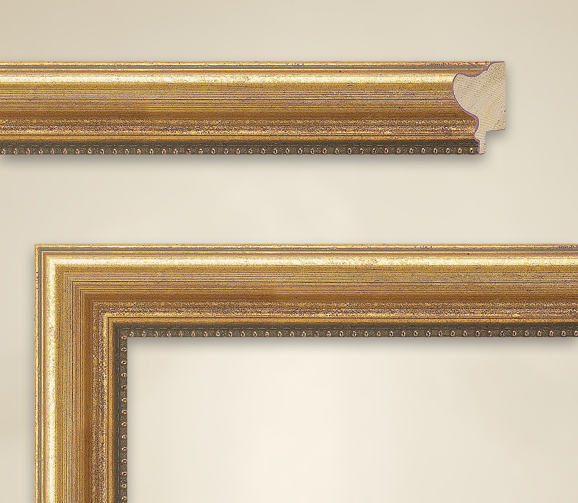 Different gold shades make the gold frame Elena something very special. Due to the different tones, sometimes brighter, sometimes darker, the colors are almost alive. The well-thought-out color scheme makes the frame shine brilliantly in the appropriate light. While the height of the frame is 20 millimeters, it comes in width by the highest of a total of four strips to 28 millimeters. The outermost barely noticeable bar is still important, because it frames the frame, so to speak - with the darkest gold tone on the picture frame. This sound is repeated inside the frame, which leads to a skilful conclusion. Small shiny gold rivets are strung together like pearls and give Elena an elegant touch. This is followed by a slightly reddish-golden bar. This shade is tapered on the thick, inner wood part towards the outside in contrast and is thus becoming brighter. A skilful visual play of colors that makes the picture frame appear like a beautiful, Italian relief - Elena is particularly suitable for noble motives.