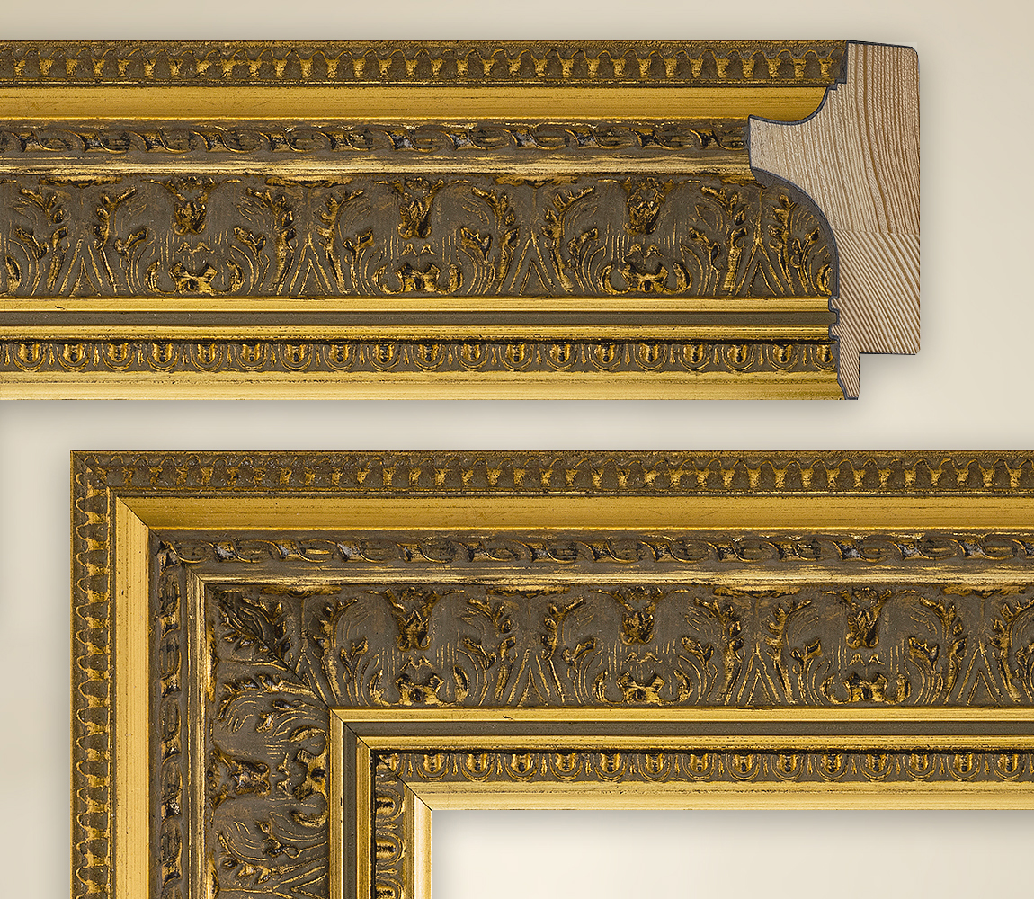 The painting frame Nelly is impressive in every picture gallery, but also for every private collector who appreciates sublime frames for his art prints. With this model, the Van Gogh frame series presents another gold frame, which the designers have created into a magnificent piece in terms of color, shape and design with various moldings. On a total width of 79 mm, trims can be seen here with, sometimes without ornaments, but always cleverly coordinated and arranged in an order worth seeing. At the outer edge, Nelly begins with the first narrow ornament bar, which shows small triangular chain links on a dark brown background. A gold-colored depression leads the way to the highest part of the frame, which is pushed into the room as a 43 mm square tongue. Here too, gold elements on brown come into their own as an ornament before the large main border pushes back towards the wall. The dark brown predominates here, so that the golden structures on it appear very delicate. The next narrow strips are called gold, brown and gold, and are accompanied by another ornament border before a last gold strip forms the collective conclusion. The overall view is dominated by dark brown, which, with the shiny gold, represents an excellent ensemble.