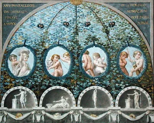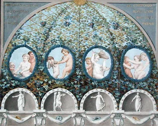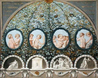 cherub · cherubim · cherubs · putto · figures en grisaille · foliate roundel · joyous · italianate · original painted in 1520 · lamb · vine · neo-classical insest · arbour · pergola · cherub · trellis · Private Collection / Bridgeman Images
