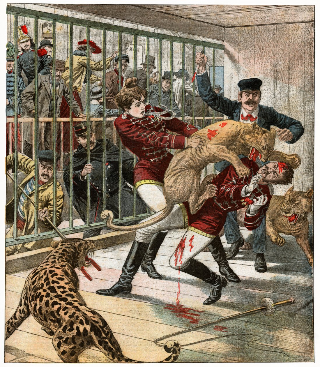 20th century · 20 century · xx century · xxth century · twentieth century · 20 20th xx xxth twentieth century · 20 20th xx xxth century · 20 20th 20th xx xxth 20th century · c20th · assault · news item · animal · animals · wildlife · wild life · 1900s · 1900's · 1900-1909 · attack · injury · injuries · injured · wound · wounded · medicine · medical · health · cage · circus · circus performance · taming · tamer · big cat · wild cat · wild animal · france · french · france french · french overseas departments and territories · european union · europe · european · europen · europe map · engraving · engraver · panther · police · traffic policemen · traffic police · police forces · blood · show · performances · performance · spectator · spectators · viewer · police officer · policeman · police officers · helping · rescue · help · mzengraving · · Private Collection / Bridgeman Images |