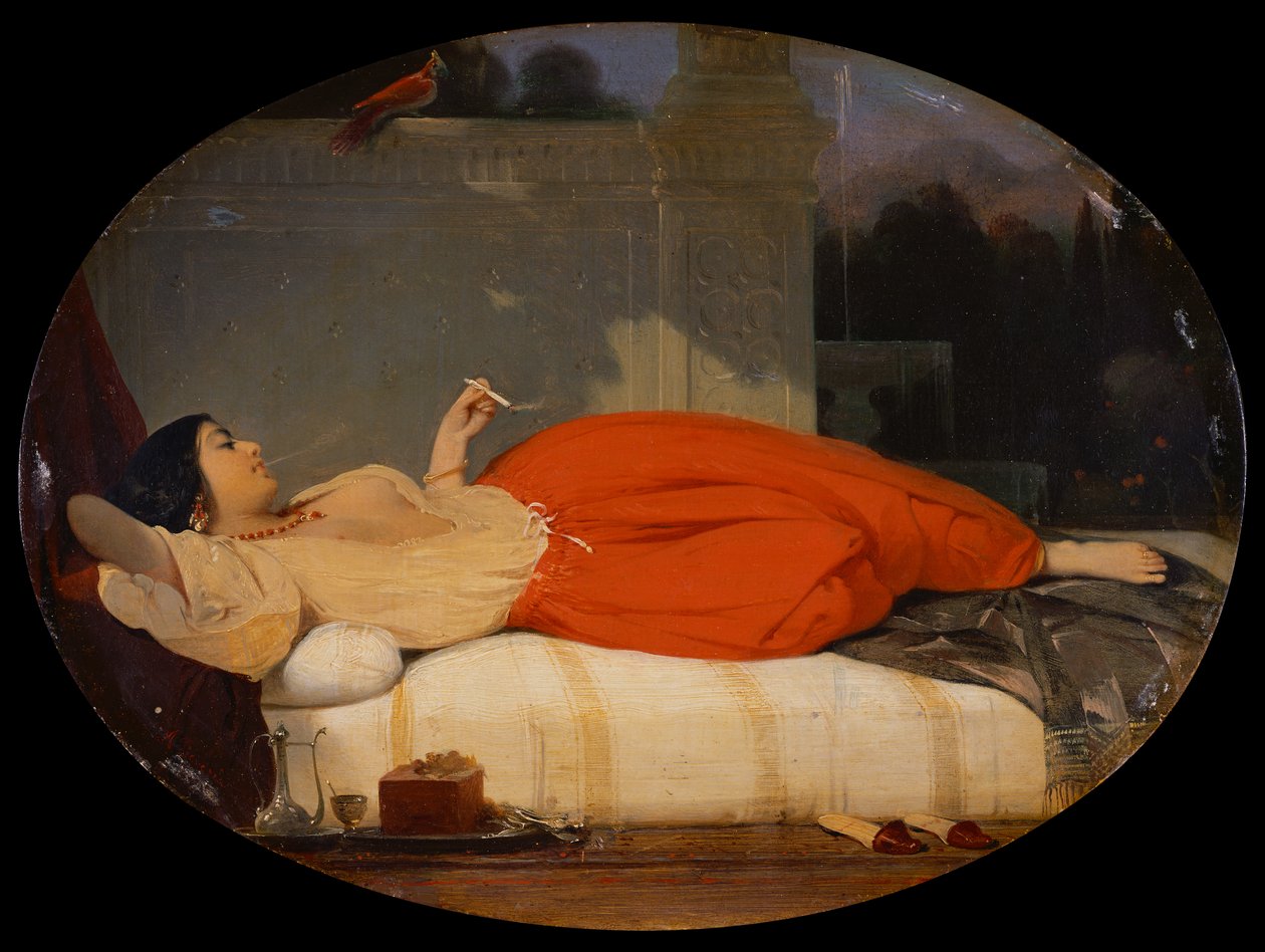 19th century · beauty · drink · cigarette · tobacco · necklace · jewel · woman · fountain · france · europe · smoking · garden · furniture · wall · bird · orientalism · painting · parrot · recycling · ecology · relaxation · one person · resting · outside · mzpainting · barefoot · · Norton Simon Museum, Pasadena, CA, USA / Bridgeman Images |