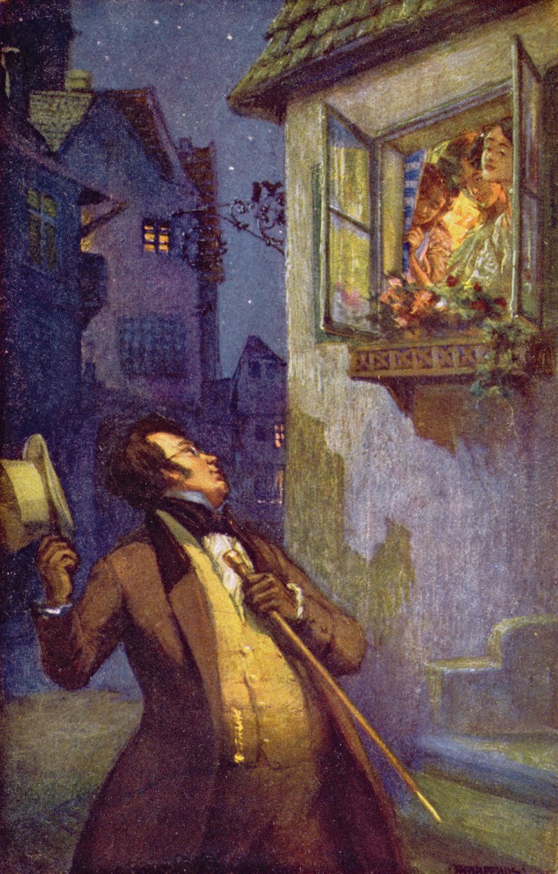 night · maidens · das maederlhaus · romance · romantic · composer · musician · girls · dreimaedlerhaus · dreimadlerhaus · operetta · male · female · portrait · seduction · serenade · serenading · courtship · lovers · nocturne · c19th · Private Collection / Bridgeman Images |