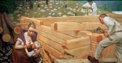 four persons · several people · breast feeding · allegory · 1900s · 20th century · woodcutter · building site · colour · lake · woman · finland · europe · scandinavia · forest · mother · parent · family · death · worker · landscape · painting · skeleton · outside · mzpainting · · Ateneum Art Museum, Finnish National Gallery, Helsinki, Finland / Bridgeman Images