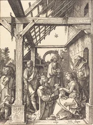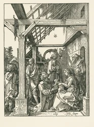 germany · building · female · women · woman · people · male · child · children · family · religious · german · arts · star · infant · baby · babies · country · religion · shape · metal · mother · christian · christianity · infancy · gold · gifts · kneeling · motherhood · gift · present · presents · renaissance · location · century · parenting · giving · birth · visiting · concept · incense · adoration · new testament · bethlehem · palestine · manger · nativity · 16th century · sixteenth century · west bank · adoration of the magi · frankincense · myrrh · star of bethlehem · christmas · woodcut · albrecht durer · albert durer · albrecht dürer · dürer · albrecht · durer · albrecht · alberto durero · heritage art · print · a durer · beit lehem · Heritage Art/Heritage Images