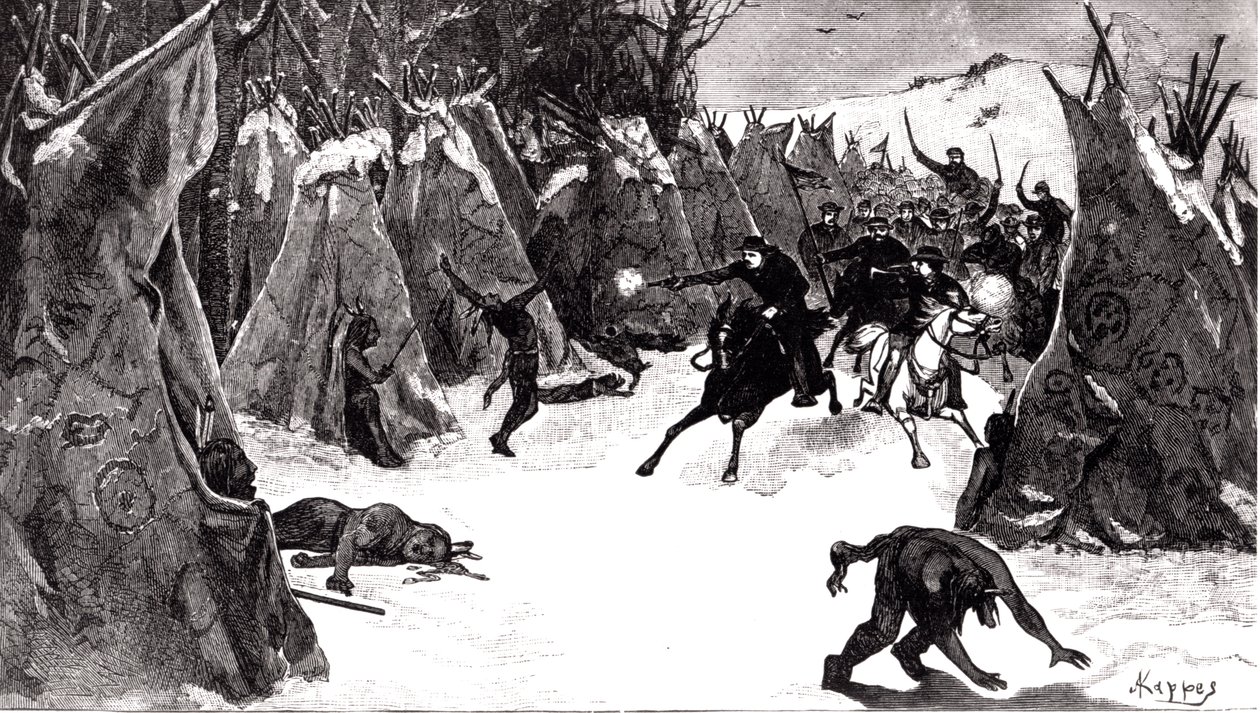 us cavalry · destroyed cheyenne village · chief black kettle · river · oklahoma · native american indian · indians · attack · teepee · wigwam · Private Collection / Bridgeman Images |