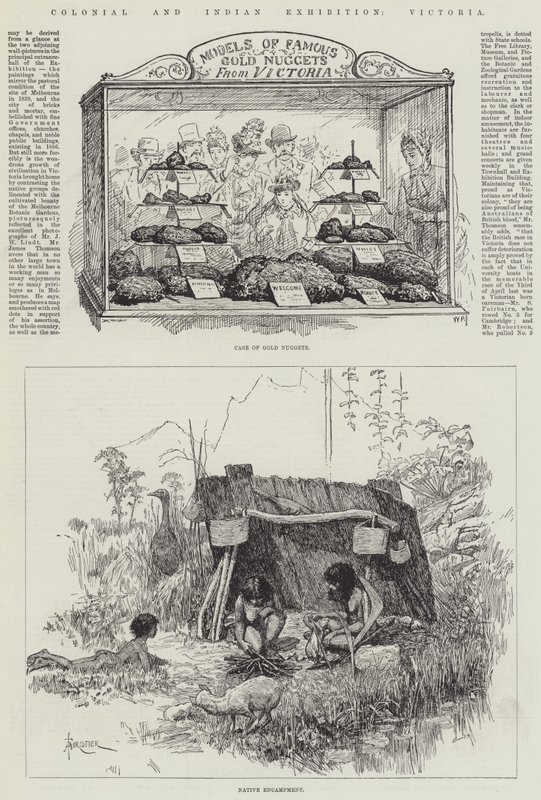 colonial · indian exhibition · victoria · case · gold nuggets · native encampment · india · colonialism · gold · aborigines · australia · london · exhibitions · Private Collection / Bridgeman Images · / Look and Learn |