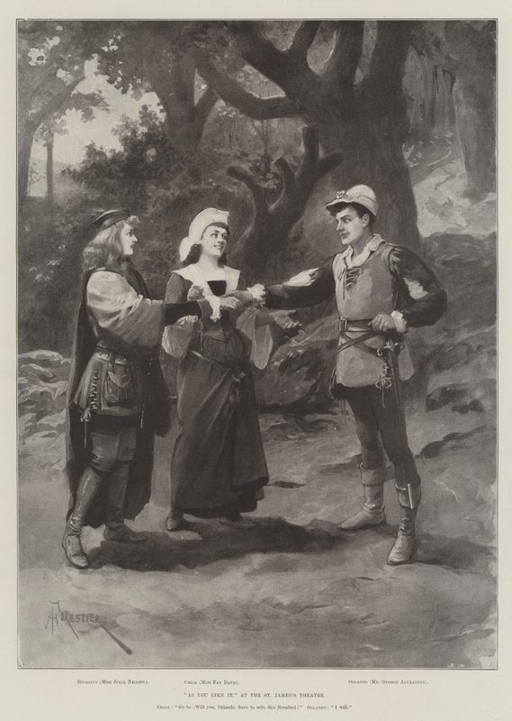 as you like it · st jamess theatre · rosalind · miss julia neilson · celia · miss fay davis · orlando · mr george alexander · performing arts · theatre · william shakespeare · london · Private Collection / Bridgeman Images · / Look and Learn |
