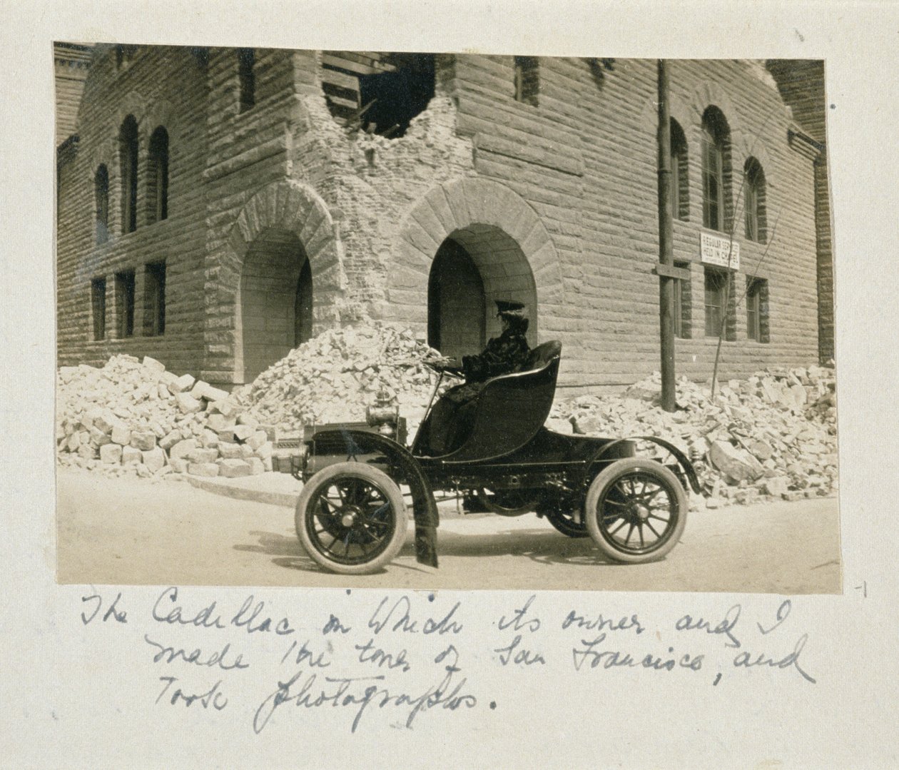 ruins · remains · ruin · city · natural disaster · automobile · motor car · motorcar · 18th april 1906 · san andreas fault line · phenomenon · destruction · aftermath · rubble · cadillac · california · californian · city · american · vintage · edwardian costume · America · North America · Schlesinger Library, Radcliffe Institute, Harvard University / Bridgeman Images |