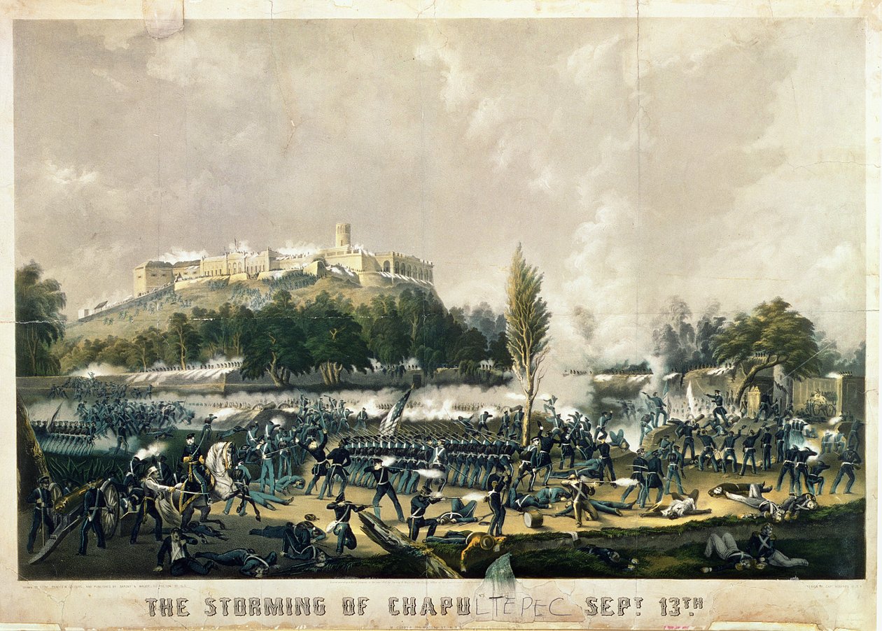 mexico city · fortress · captured by us forces · soldiers · battle · troops · dead · dying · wounded · mexican american war · gunfire · flags · soldiers · canons · swords · formation · Private Collection / Bridgeman Images