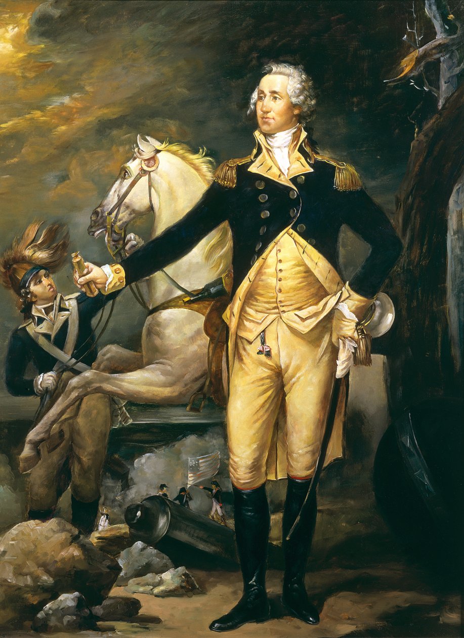 full length · male · american flag · horse · stars and stripes · cannon · telescope · american · first · politician · battlefield · America · North America · Private Collection / Bridgeman Images