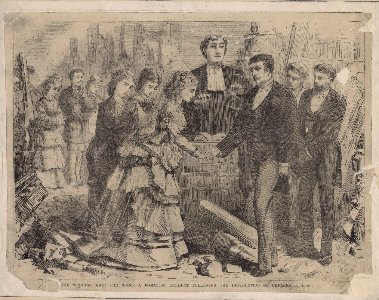 wedding · marriage · bridge · groom · vows · nuptials · ruins · ruin · destruction · remains · rubble · devastation · romantic incident · couple · wife · husband · ceremony · vicar · preacher · chicago · illinois · america · american · great chicago fire · fire · conflagration · destroyed · 1870s · c19th · romance · aftermath · post-fire · US · North America · Chicago History Museum, USA / Bridgeman Images |