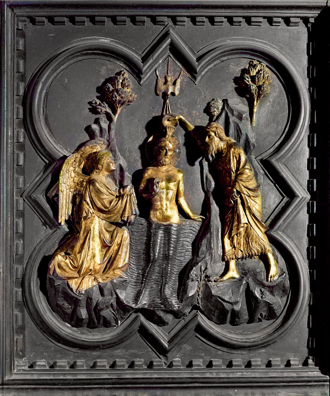 The Baptism of Christ, panel from the south doors of the Baptistry depicting scenes from the life of St. John the Baptist, 1336(The Baptism of Christ, panel from the south doors of the Baptistry depicting scenes from the life of St. John the Baptist, 1336 (gilt bronze))Andrea Pisano |