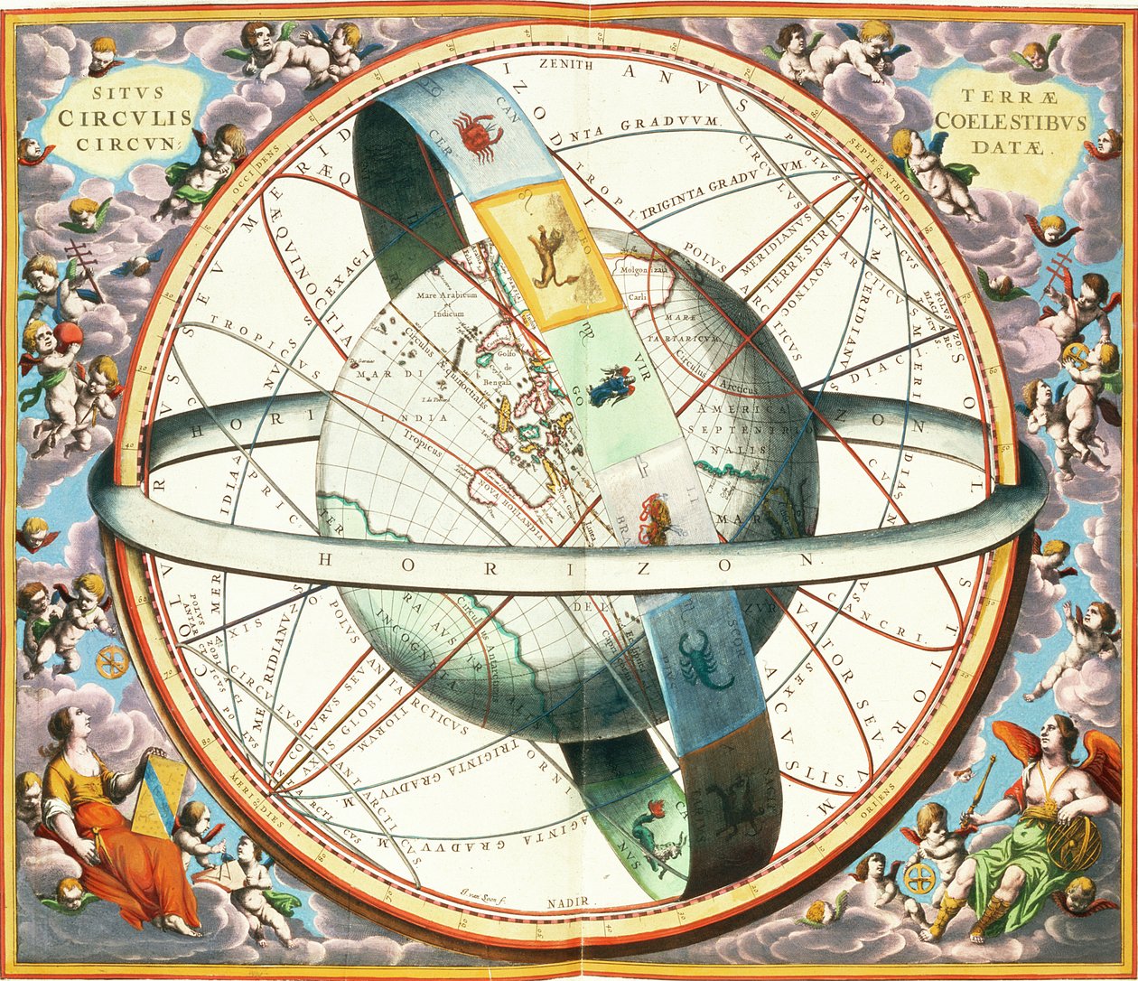 print · armillary sphere · horoscope · star sign · zodiac · cherub · globe · astrology · orbits · astronomy · Private Collection / Bridgeman Images