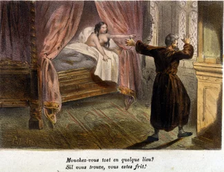 Gallant scene: Monk, in the company of a naked woman in bed, surprised by the arrival of a person, tries to hide. Colour engraving of the 19th century(Gallant scene: Monk, in the company of a naked woman in bed, surprised by the arrival of a person, tries to hide. Colour engraving of the 19th century. .)Anonymous Anonymous |