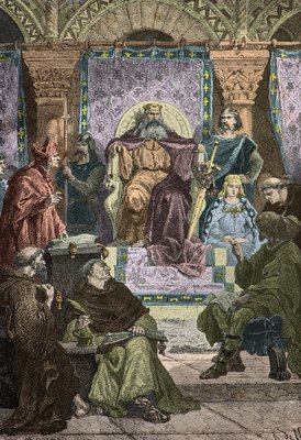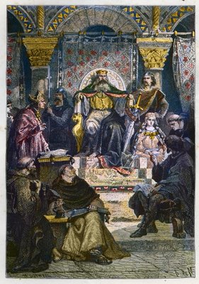 Charlemagne (742 - 814) on His Throne Presiding Over the Palace Academy - engraving from 'L'histoire de France racontee'(Charlemagne (742 - 814) on his throne presiding over the Palace Academy - Charles the Great (747-814) King of the Franks and Christian Emperor of the West presiding over the Palace School in Aachen (Aachen) - engraving from “” L'histoire de France racontee)Anonymous Anonymous |