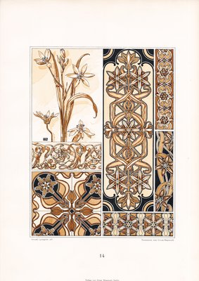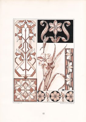 Monochrome Carnation Motifs and Ornaments Floral Ornament Studies and Borders in Sepia Tones Stylized Lily Motifs in Various Ornamental Forms Stylized Leaf Ornaments in Sepia Tones Stylized Floral Patterns in Gold-Brown Tones Ornamental Studies with Bleeding Hearts and Stylized Leaf Motifs Rose Ornament Studies in Green Tones Lily Ornaments in Monochrome Composition Daisy Ornaments in Green Color Scheme Carnation Motifs and Ornamental Surface Patterns in Monochrome Poppy Flower Ornaments in Monochrome Stylized Thistle Ornaments in Black and White Cornflower Ornament Studies in Blue Tones Blue and White Wild Rose Motifs and Ornamental Structures Art Nouveau Panels with Iris and Floral Ornaments The Crown Imperial Decorative Documents Ornamental Window Arch with Sunflowers and Tulips Primrose Motifs and Floral Ornament Variations Crown Imperial Flower, Fritillaria Imperialis, in Wallpaper and Fabric Patterns, and as Design for a Steel Art Object Thistle Ornamentation in Blue and White Coloring Crown Imperial Flower in Wallpaper and Fabric Patterns, and as Design for a Wrought Iron Lamp The Crown Imperial Documents Decoratifs The Periwinkle The Jonquil Documents Décoratifs, 1902