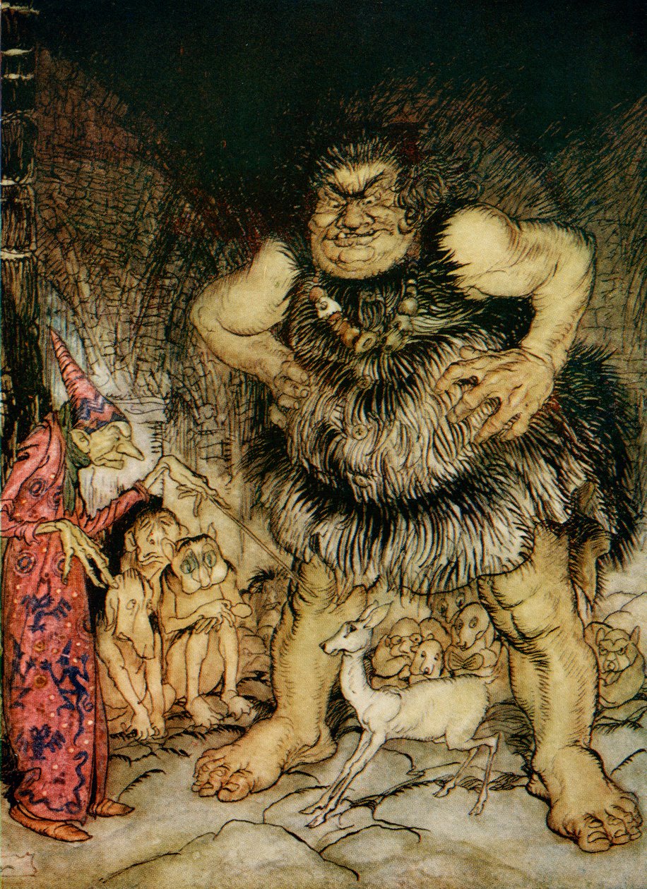 giant · gigantic · galligantua · ogre · monster · wicked · magician · white · hind · magic · evil · jack · frightening · fear · fright · rackham · illustration · english · fairy · tale · tales · story · stories · children · childrens · classic · literature · Private Collection / Bridgeman Images |