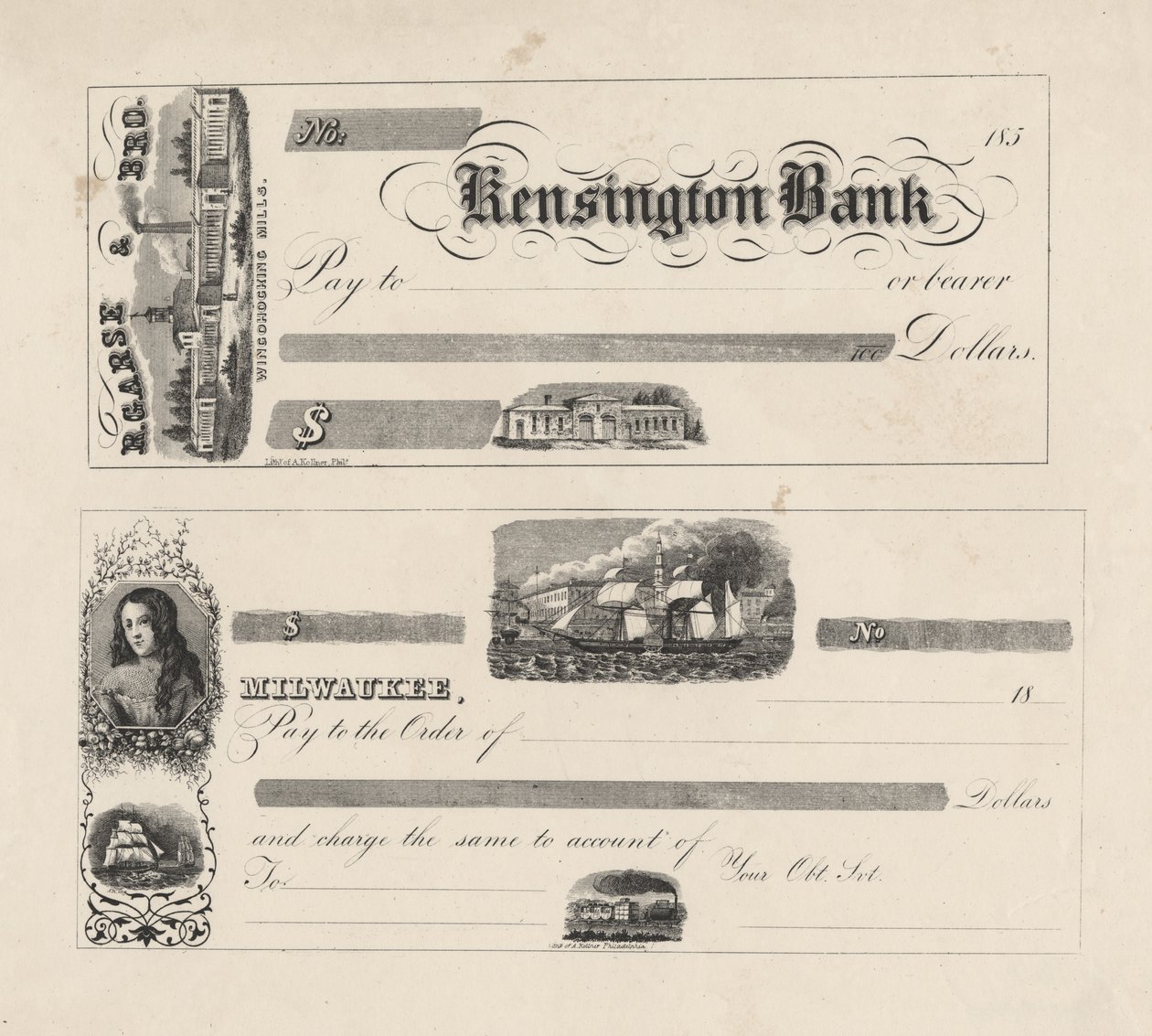 wingohocking mills · mill · frankford creek · philadelphia · money · banknote · cheque · kensington bank · united states · america · american · ship · ships · train · transport · banknotes · Milwaukee · Free Library of Philadelphia / Bridgeman Images |