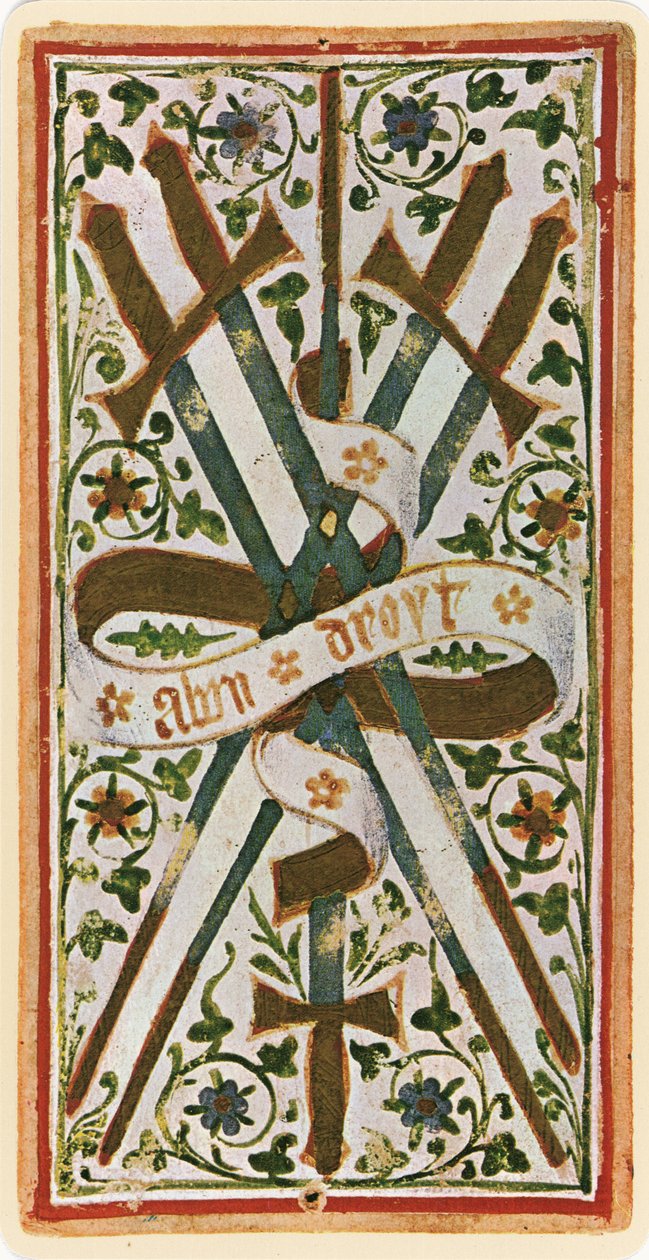 minor arcana · c15th · tarock · tarocchi · cards · game · divination · deck · tarot · cartomancy · prediction · clairvoyance · fortune-telling · fortune telling · cartomancer · card reader · magic · occult · symbol · symbolism · symbolic · oracle · superstition · omen · suit · gold leaf · swords · trionfi deck · triumph · trump · play · playing · pastime · uncertainty · losses · opponents · adversaries · banner · scroll · crossed · flowers · leaves · ornament · ornamental · decoration · symbols · medieval · renaissance · Private Collection / Bridgeman Images