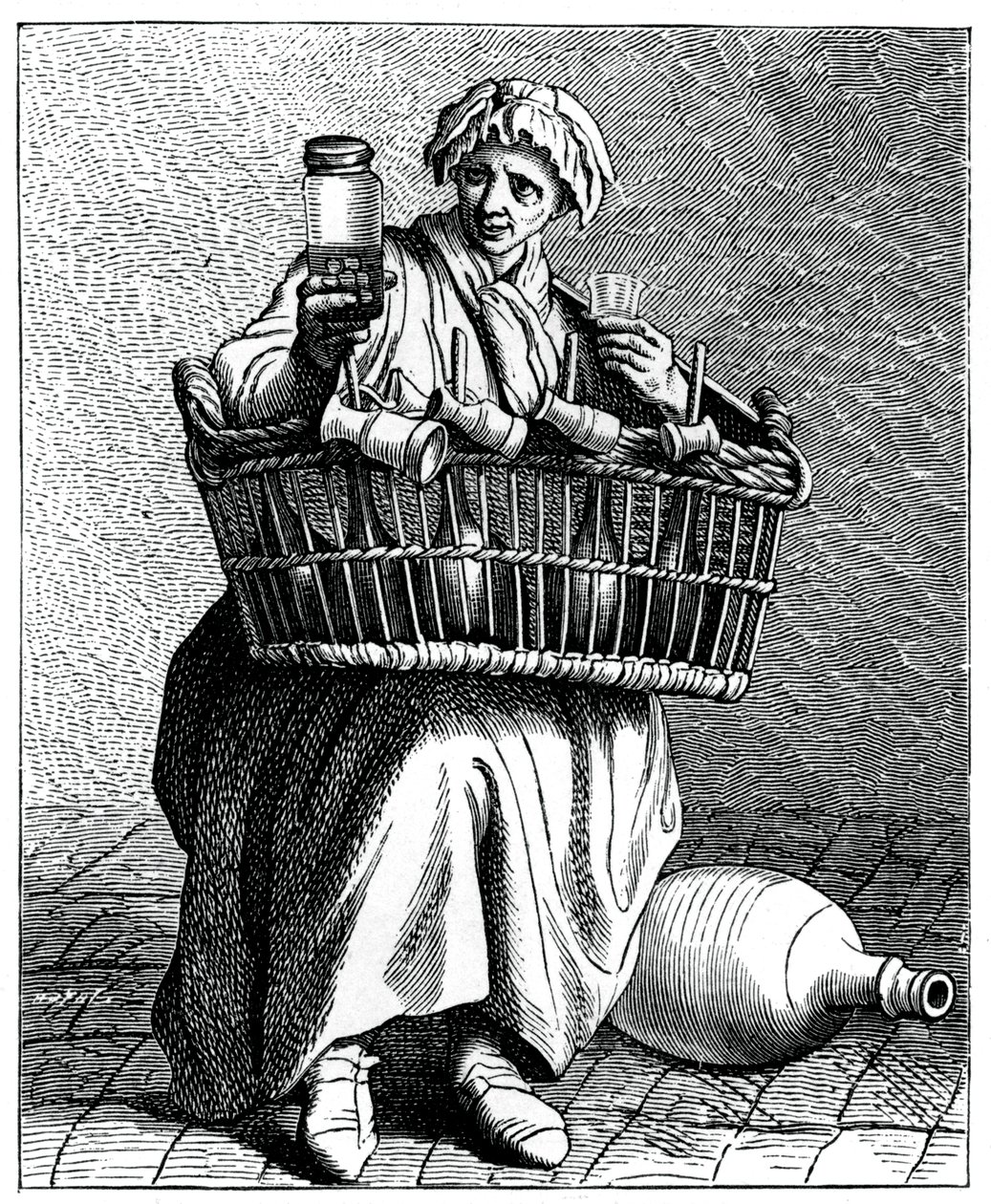 drink · female · women · woman · people · country · french · france · bottles · basket · alcohol · bottle · location · century · lady · monochrome · brandy · street vendor · black white · black and white · 18th century · eighteenth century · eau-de-vie · paris street cries · engraving · cries of paris · bouchardon · The Print Collector/Heritage Images