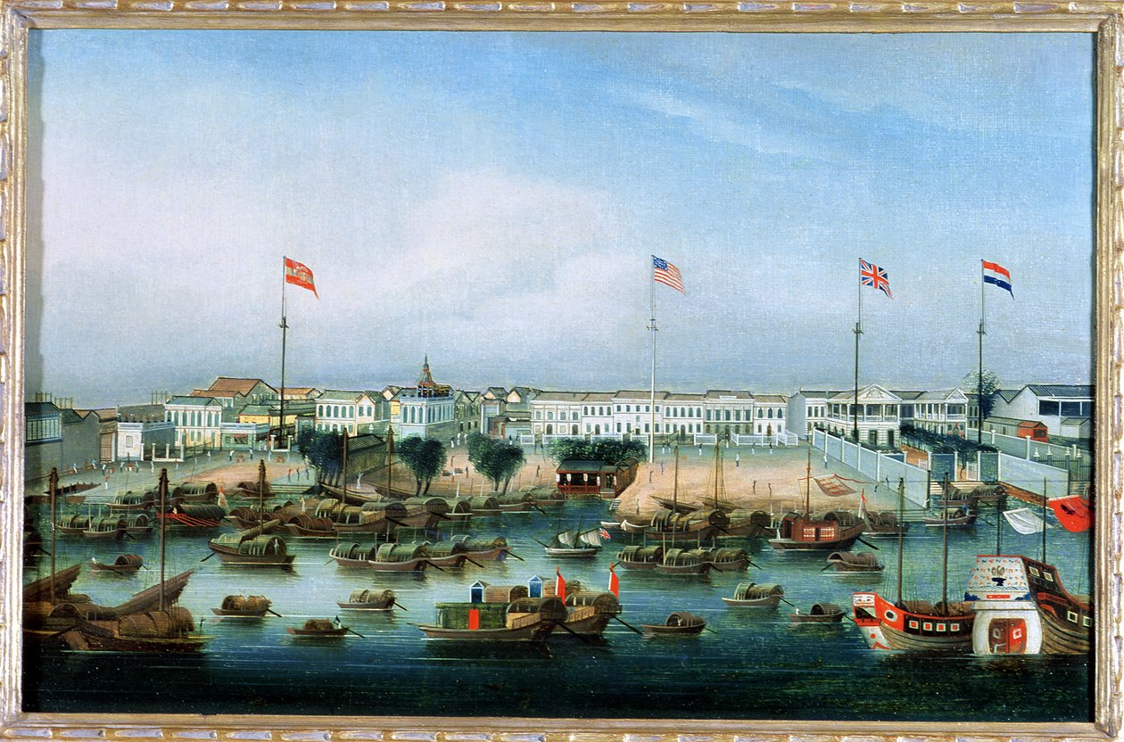 hong · waterfront · guangzhou · junks · harbour · port · warehouse · flag · austrian · american · british · dutch · international factories · commercial trade · merchant ships · ship · boat · coast · coastal · boats · flags · junk · Private Collection / Bridgeman Images |