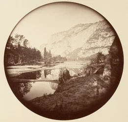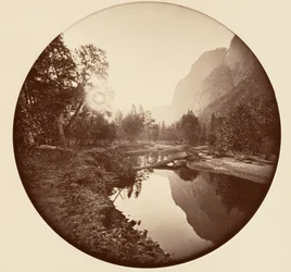 nature · forest · yosemite national park · california · woods · woodland · tree · wood · plant · plants · rocks · rock · mountain · mountains · country · shape · round · reflection · lake · rocky · national park · geography · color · location · circular · victorian · century · sepia · yosemite valley · reflected · united states of america · colour · 19th century · black white · black and white · nineteenth century · american · trees · america · geographical feature · photograph · landscape · united states · albumen photograph · carleton emmons watkins · carleton e watkins · watkins · carleton emmons · heritage art · Heritage Art/Heritage Images