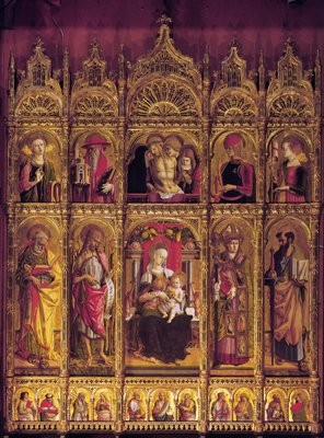 altarpiece · polyptych · virgin · child · christ · saints · saint · saint paul · saint john the baptist · saint etienne · saint paul · gold · flowers · flower · fruit · garlands · garland · half moon · lamentation · lamenting · liturgy · martyr · apostle · prophet · 15th century · Pinacoteca, Ascoli Piceno, Italy / Bridgeman Images