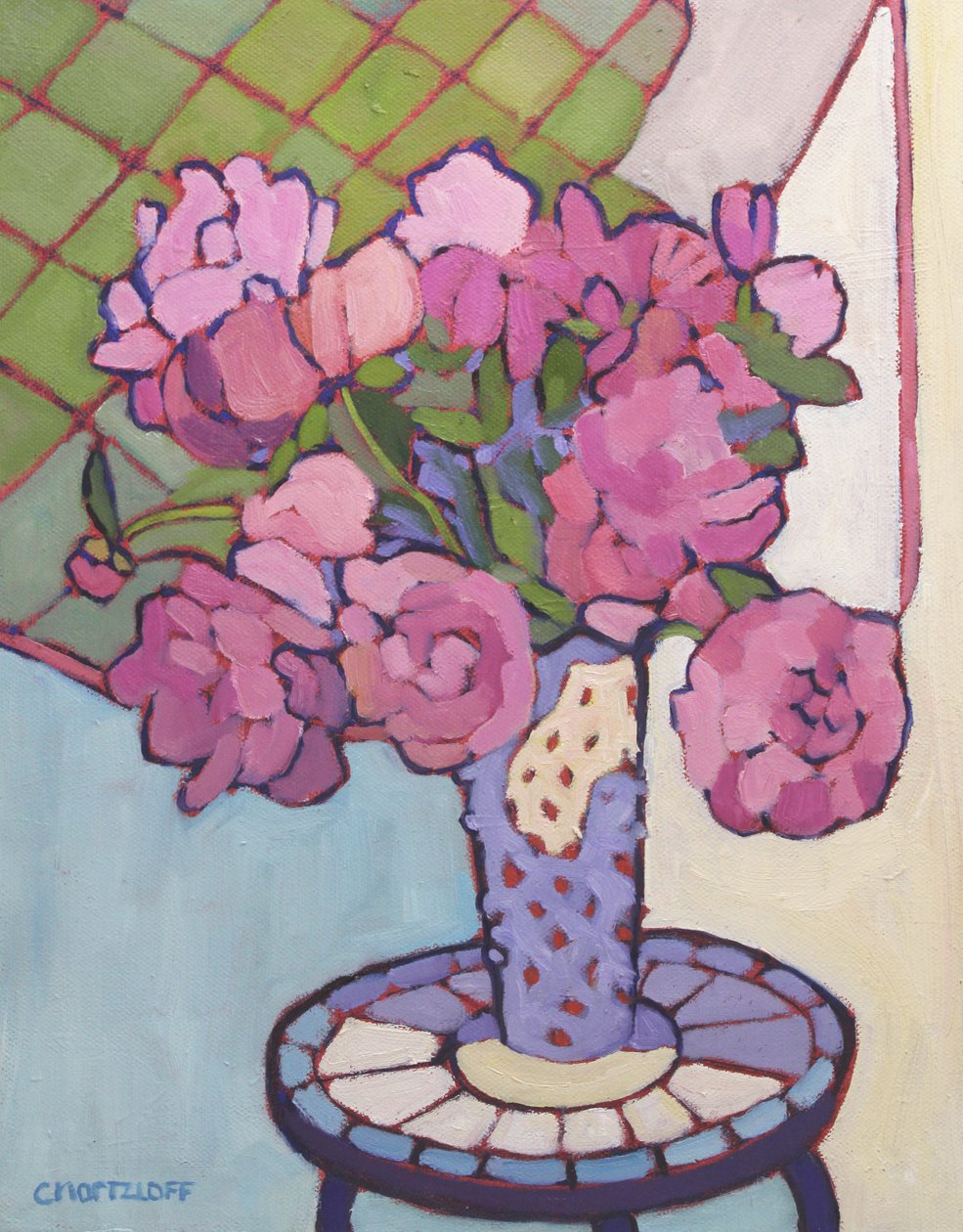 white · colour · decoration · summer · season · flower · geometry · shadow · painting · pink · nobody · table · furniture · vase · green · mzpainting · interior · peony · 2020s · 21st century · contemporary artist · silhouette · female artist · artist · · Private Collection / Bridgeman Images |