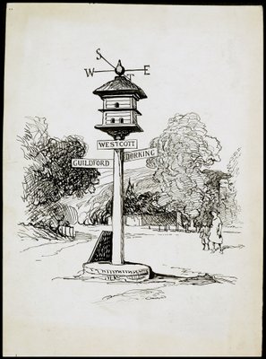 weather · travel · countryside · england · female · women · woman · people · child · children · arts · country · british · english · village · rustic · direction · weather vane · location · signpost · drawing · britain · lady · concept · surrey · weathervane · monochrome · black white · black and white · rural · english heritage · dovecote · rural life · charles george harper · harper · charles george · cg harper · harper · cg · westcott · Historic England Archive/Heritage Images