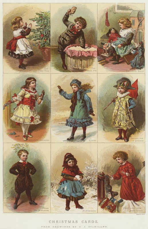 christmas cards · christmas tree · bran pie · lecturing · dolly · christmas crackers · sliding · dressed · charade · mistletoe · snowballing · fairy · gifts · santa claus · children · christmas · fashions · clothing · Private Collection / Bridgeman Images · / Look and Learn
