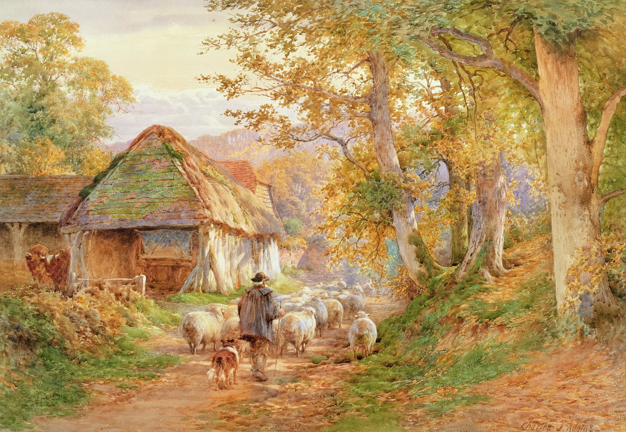 shepherd · flock · sheep · collie · sheepdog · country lane · rural · farm · barn · bucolic · return · returning · herding · herd · countryside · pastoral · Private Collection / Bridgeman Images |