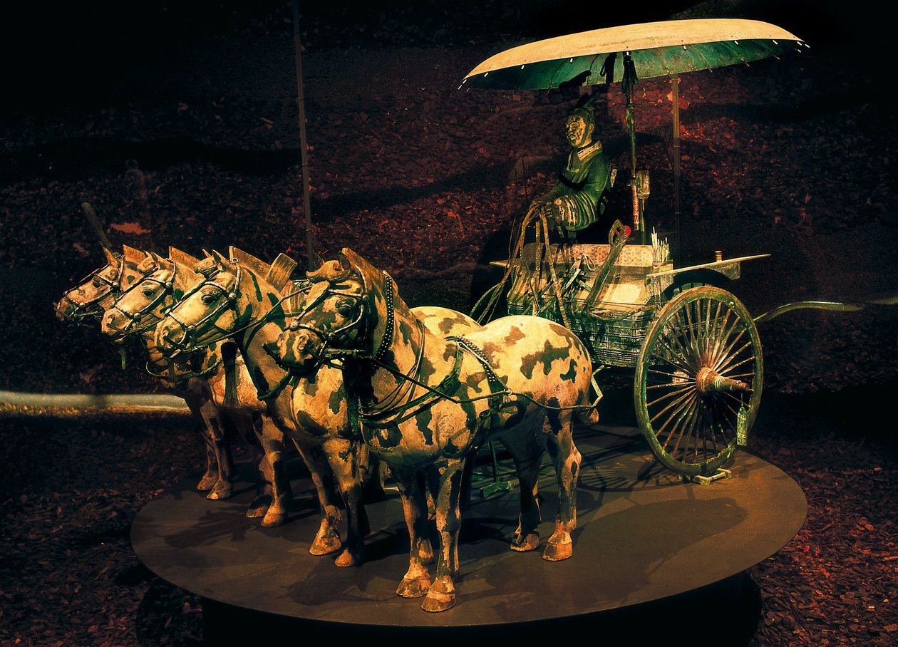 antiquity,antique,art,asia,asian,asians,bronze,metal,horse,horses,animal,wildlife,farm animal,livestock,china ,chinese,chineses,umbrella,tomb,transport,mausoleum,horse statues,horse and carriage,chariots · asian · harness · transport · animal · antiquity · carving · horse · china chinese · bronze · metal · pilot · Tomb of Qin shi Huang Di, Xianyang, China / Bridgeman Images |