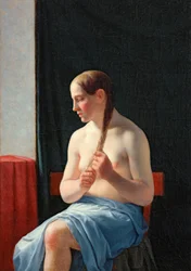 (Nude model sitting. Portrait of a woman braiding her hair (braid). Painting by Christoffer Wilhelm Eckersberg (1783-1853))