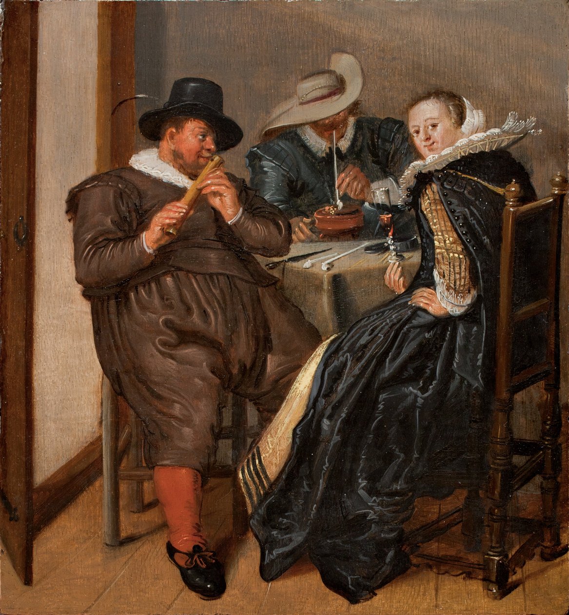 festive · musician · playing · flute · table · interior · jolly · smoking pipe · pipes · flemish · netherlandish · traditional · costume · hats · female · male · intimate · Worcester Art Museum, Massachusetts, USA / Bridgeman Images