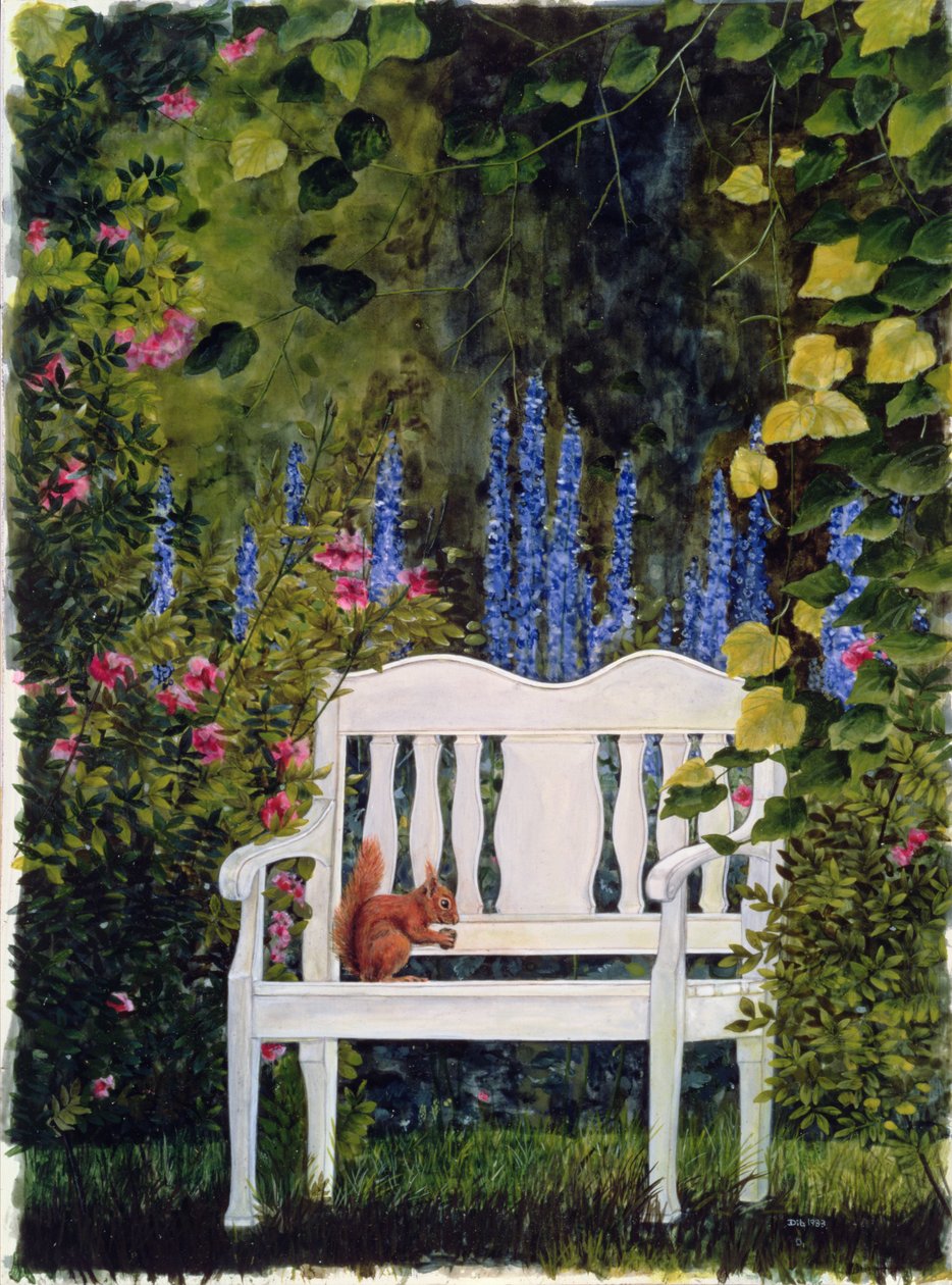 20th century · 20 century · xx century · xxth century · twentieth century · 20 20th xx xxth twentieth century · 20 20th xx xxth century · 20 20th 20th xx xxth 20th century · c20th · 1980s · eighties · 1980-1989 · 1980's · arts · bench · garden · giardini · park · colour · colours · color · coloured · colors · squirrel · animal · animals · wildlife · leaf · leaves · botany · botanical · natural history · science · flower · flowers · floral · wild flowers · flowering plant · painting · paint · paintings · nobody · without anyone · no people · one animal · only one animal · delphiniums garden seat red squirrel · InteriordesignOK · interiordesignok · Private Collection / Bridgeman Images |
