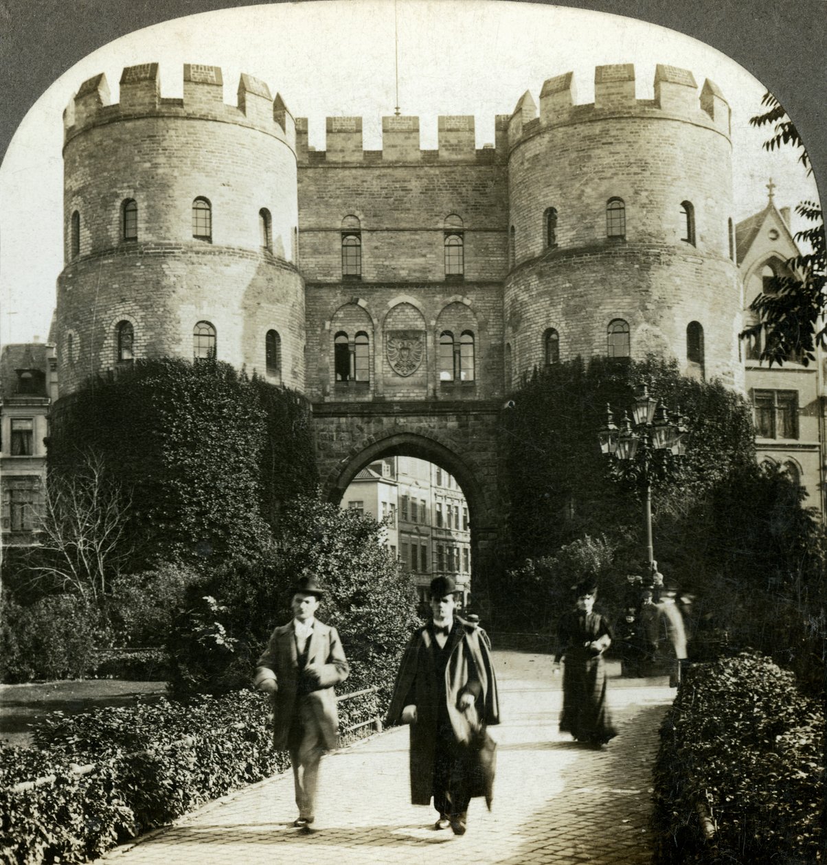 exterior · germany · italy · building · buildings · people · male · walking · architecture · archway · arch · german · country · path · pedestrian · rome · tower · castle · defence · fortification · roman · entrance · location · cologne · battlements · outside · nordrhein-westfalen · monochrome · rambling · architectural feature · black white · black and white · stereoscopic · stereoscopic photography · city gate · photograph · stereoscopic card · ew kelley · kelley · ew · The Print Collector/Heritage Images