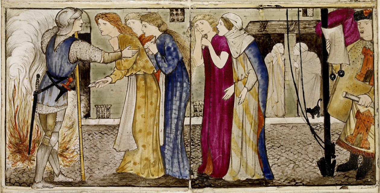 westernart · tile · tiles · pair · william morris · briar rose · pre raphaelite · pre-raphaelite · ceramic · painted · decorative · design · arts and crafts · neo gothic · neo-gothic · gothic revival · narrative · folk · folk tale · fairy tale · fairytale · sleeping beauty · princess · curse · magic · supernatural · soldier · fire · burning · news · alarmed · herald · guard · town crier proclamation · street scene · male · female · women · Ashmolean Museum, University of Oxford, UK / Bridgeman Images
