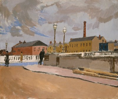 outdoors · urban · road · building · buildings · female · women · woman · people · male · street · painting · warehouse · bridge · color · colour · lane · ireland · chimney · factory · avenue · cork · location · century · thirties · lady · twenties · county cork · background people · 1930s · 1920s · 20th century · oil on canvas · landscape · national museum cardiff · kay kays · edward morland lewis · lewis · edward morland · National Museum of Wales/Heritage-Images