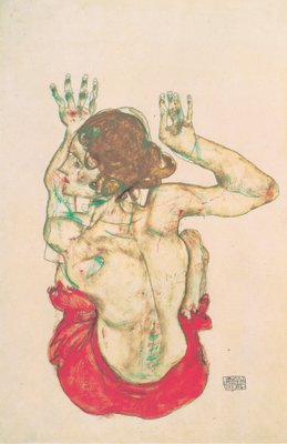 Seated Female Nude Back View with Red Skirt(Sitzender weiblicher Rückenakt mit rotem Rock)Egon Schiele |