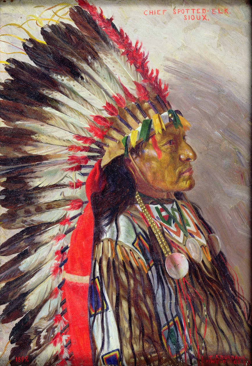 ceremony · north america · america (continent) · elder · native american indian · wild west · western · profile · feathered headdress · ritual · traditional costume · north america · feathers · jewellery · tribe · tribal · portrait · america · male · old west · traditional dress · jewelry · leader · ogallala sioux · Painting · Mzpainting · / Bridgeman Images
