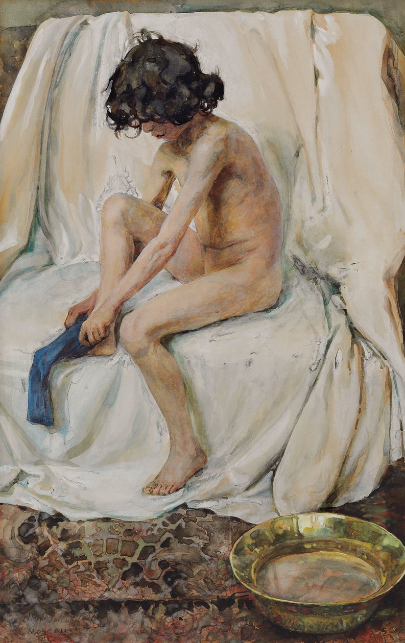 chair · 20th century · elena polenova · seat · arm chair · after · female · girl · artist-russian · brown hair · brunette · personal cleanliness · armchair · getting dressed · on paper · curly hair · active · apparel · toilet · people · decor · expression · interior decoration · clothes · skin · watercolour · full length · mounted on paper · dark hair · caucasian · bathing · caucasian ethnicity · looking down · human · posture · seating · water colour · hair · socks · mid 20th century · watercolor · washing · 20th century painting · action · person · seated · furniture · naked · paper · dressing · sitting · water color · hygiene · sheet · ethnic origin · clothing · sock · full-length · dress · physical activity · side view · artist russian · attire · twentieth century · washbowl · artwork · russian artist · nude · russian · girls · facial expression · one person · side · painting · polenova · Private Collection / Bridgeman Images |