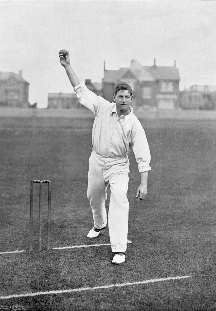 cricketer · full length portrait · bowler · bowling · stumps · crease · pitch · sport · male · Private Collection / Bridgeman Images |