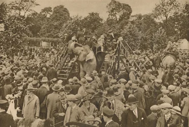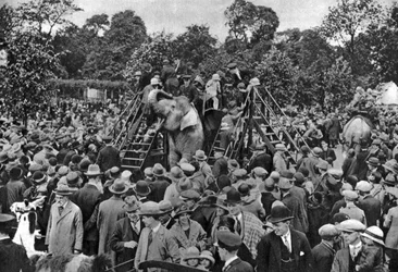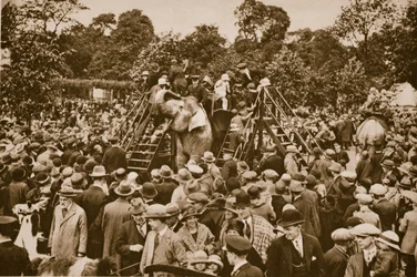 crowd · ladder · elephants · leisure · recreation · animals · elephant · riding · spectators · black and white photograph · b w photo · edwardian · leisure · Private Collection / Bridgeman Images
