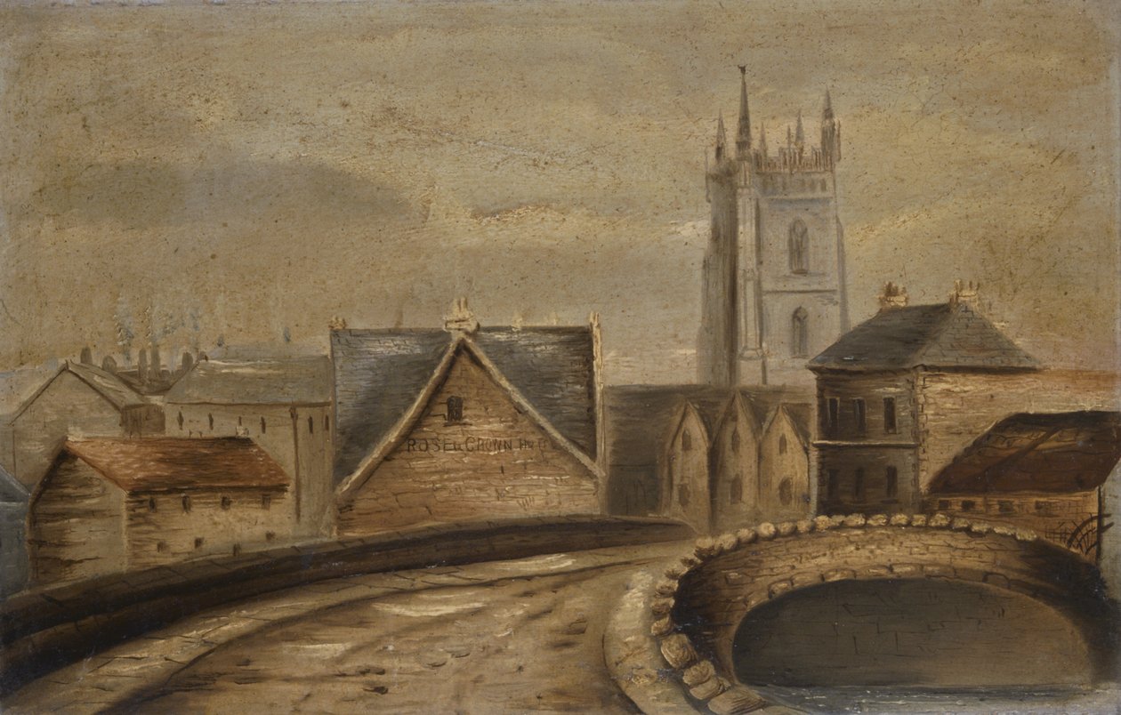 church · bridge · city · rose and crown · public house · tower · capital · tavern · town · river taff · bridge · welsh · painting · Mzpainting · National Museum Wales / Bridgeman Images |