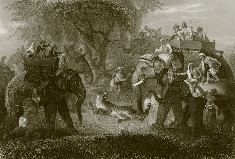 tiger · hunt · elephant · villagers · harpoon · india · Private Collection / Bridgeman Images · / Look and Learn |