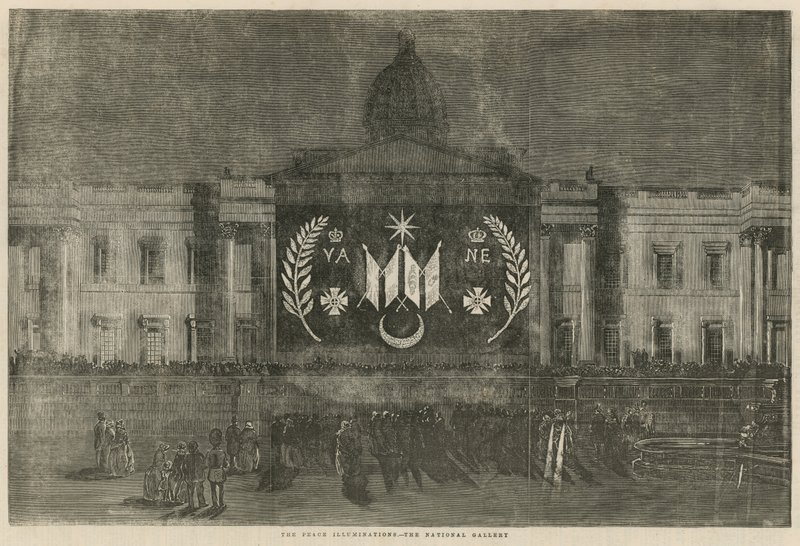 peace · art galleries · london · crowds · illuminations · peace illuminations · adorning · national gallery · Private Collection / Bridgeman Images · / Look and Learn |