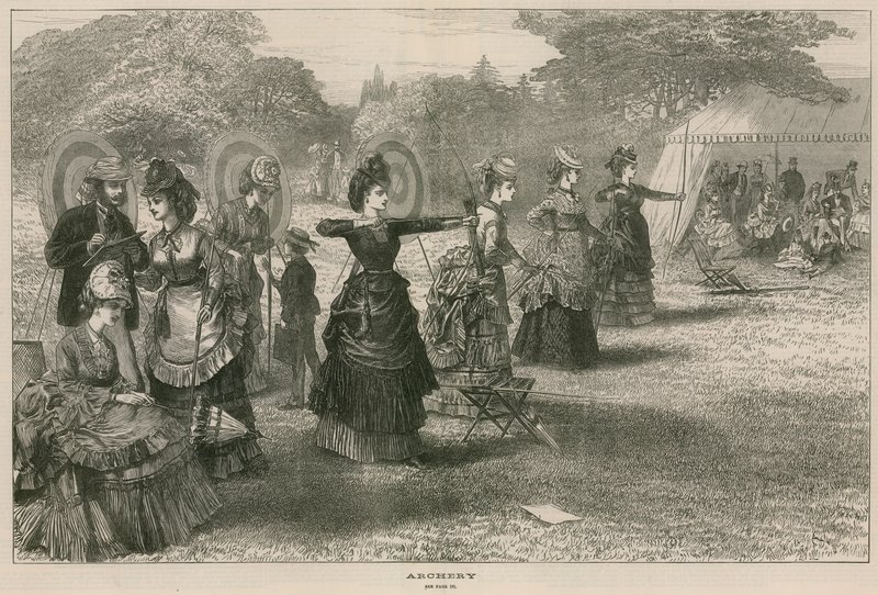 archery · ladies · archery · competition · illustrated london news · 24 august 1872 · sport · entertainment · clothing · Private Collection / Bridgeman Images · / Look and Learn