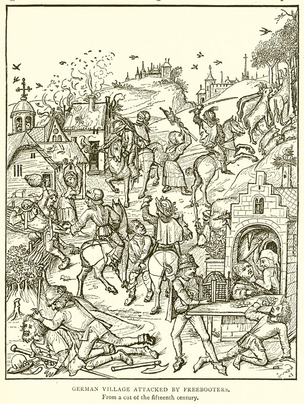 ethnology · german village · attacked · freebooters · Private Collection / Bridgeman Images · / Look and Learn |