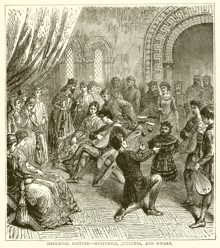 mediaeval pastime · minstrels · jugglers · dwarf · games · middle ages · music · Private Collection / Bridgeman Images · / Look and Learn