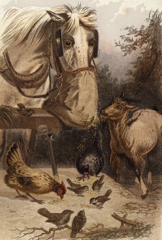 horse · farmyard · eating · nosebag · goat · sparrow · chicken · bird · sack · animals · hungry · Private Collection / Bridgeman Images · / Look and Learn |